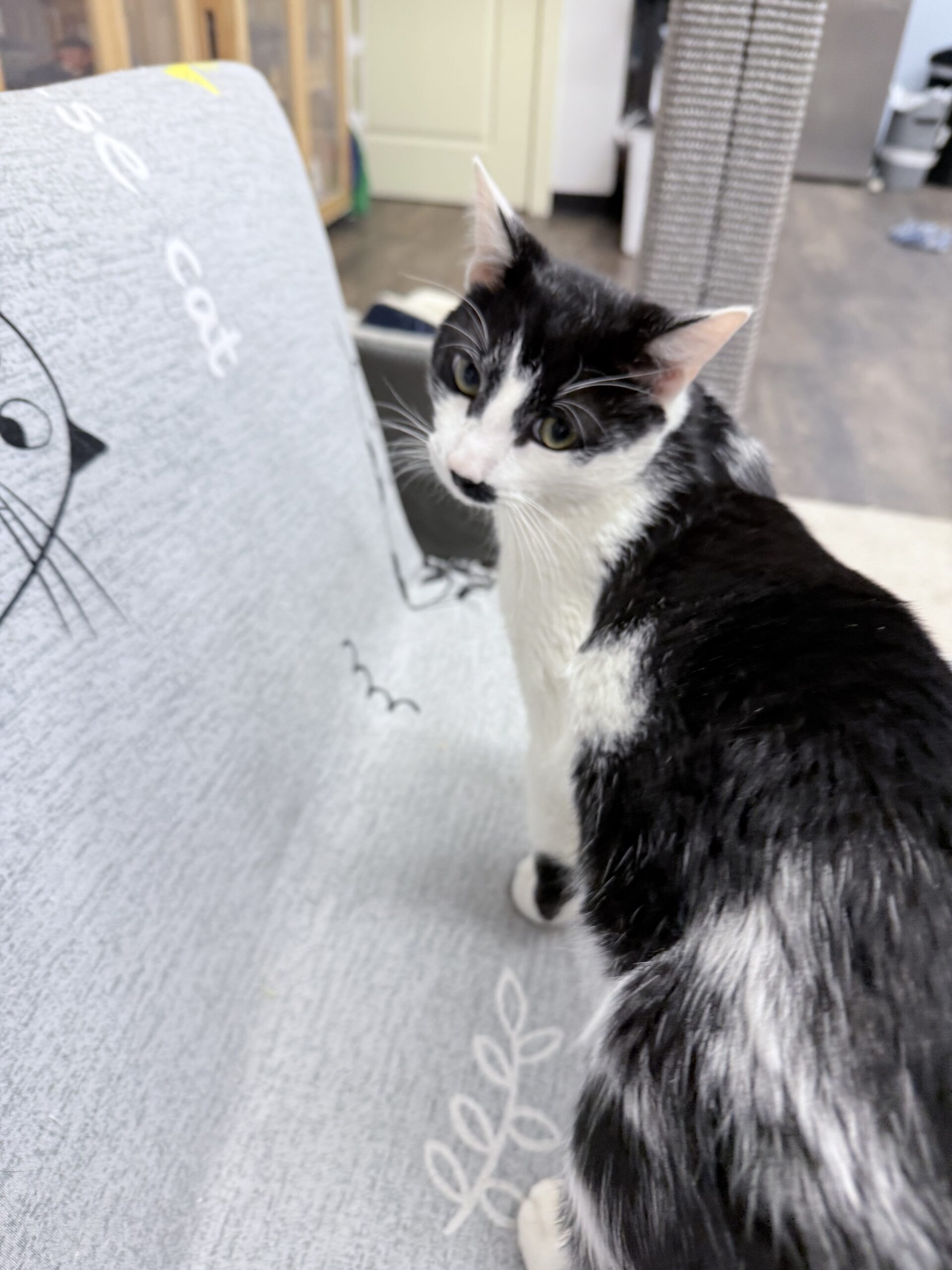 Blot is just 1 year old and already a master of cuddles and playtime. He’ll pounce on feather toys with kitteny enthusiasm, then melt into your lap for a good snuggle session. He’s got the gentlest purr, the softest fur, and the biggest heart. Whether he’s chasing shadows or nuzzling into your shoulder, Blot brings a little joy to every moment.