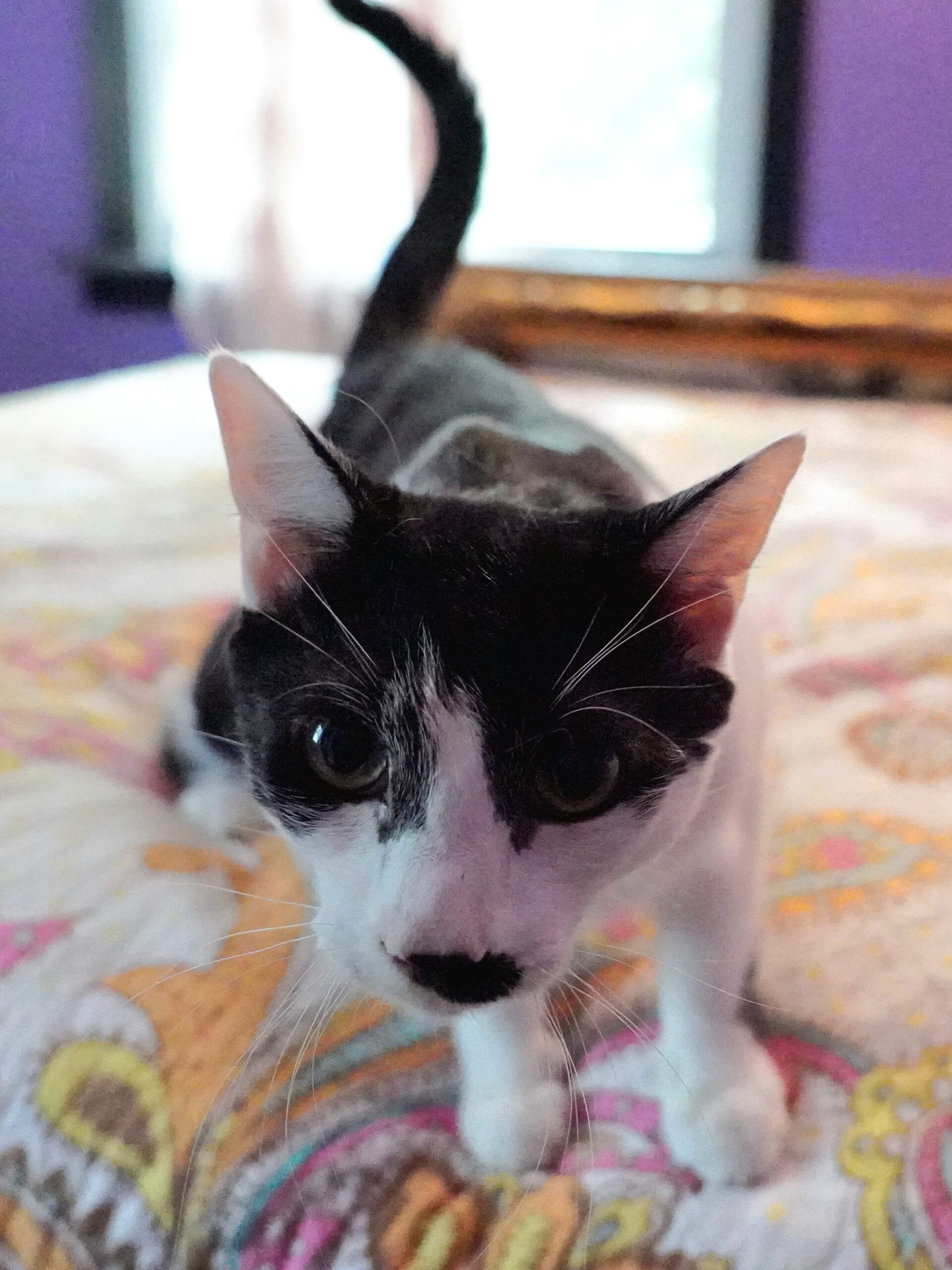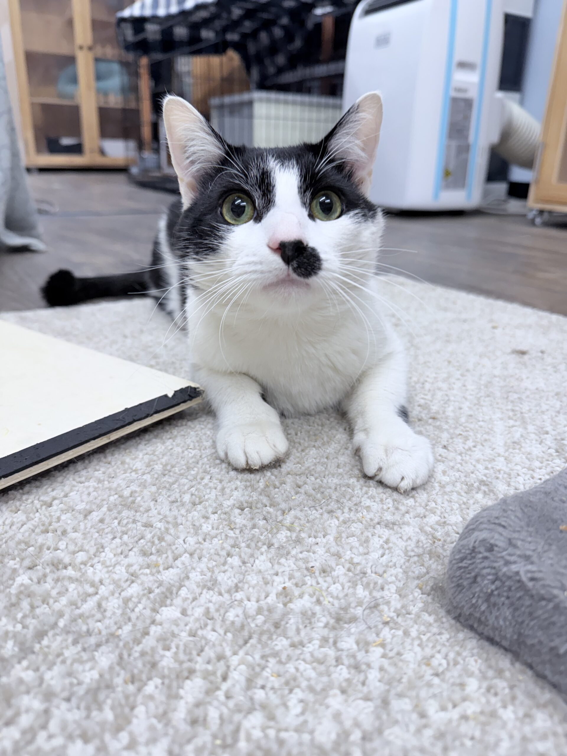 Blot was found wandering the streets all alone on Easter morning, like a tiny black-and-white bunny on the wrong holiday mission. With his perfectly splashed nose and soft tuxedo coat, he looked like a little ink blot brought to life—so, of course, the name stuck!