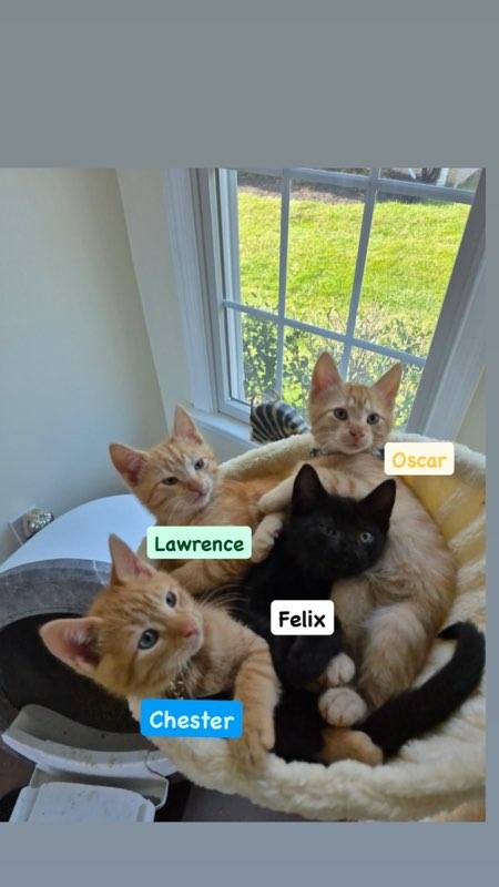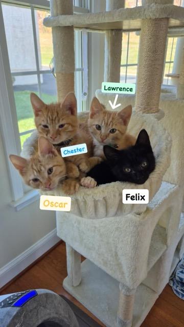 Introducing Lawrence, Chester, Oscar, and Felix — four absolutely adorable brothers who are just as sweet, playful, and cuddly as they look! These boys share a wonderful bond and love spending time together, but they’ll do best being adopted in pairs of two. Any combination of two should work beautifully — they all get along and love each other dearly.
