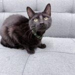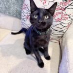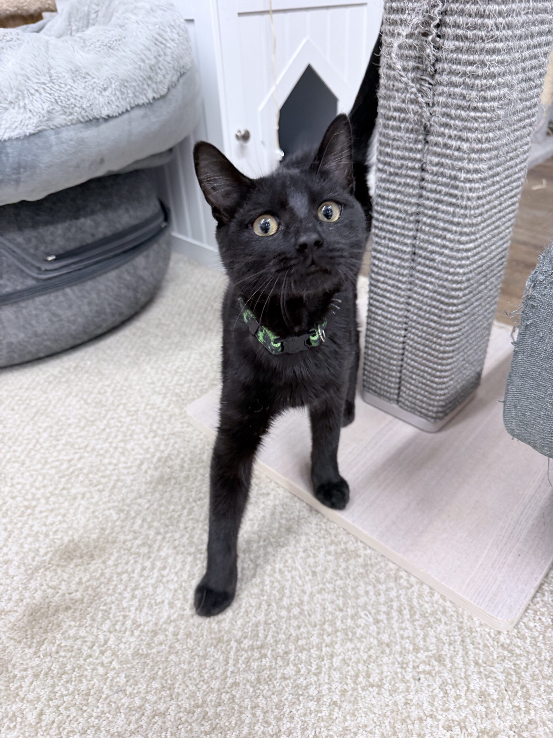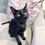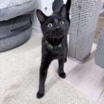 Nami’s story begins on a quiet street where neighbors kept hearing the same soft, desperate cry outside their doors. A small black kitten — barely nine months old — was making her rounds, going porch to porch, meowing for someone to notice her. She was heartbreakingly thin, her fur dull from hunger, and around her neck hung a tattered collar that had once fit properly but now hung loose and oversized, a silent marker of how much weight she’d lost.