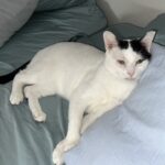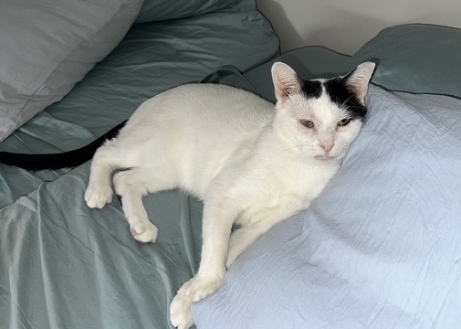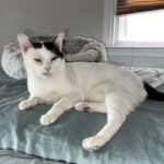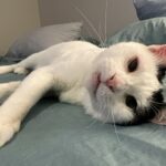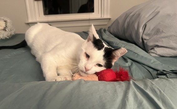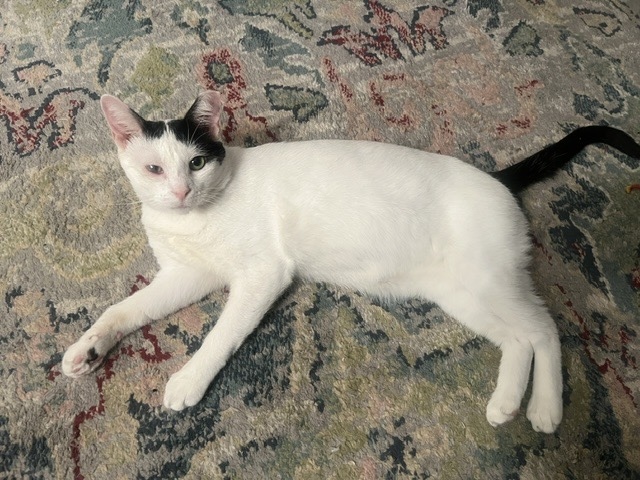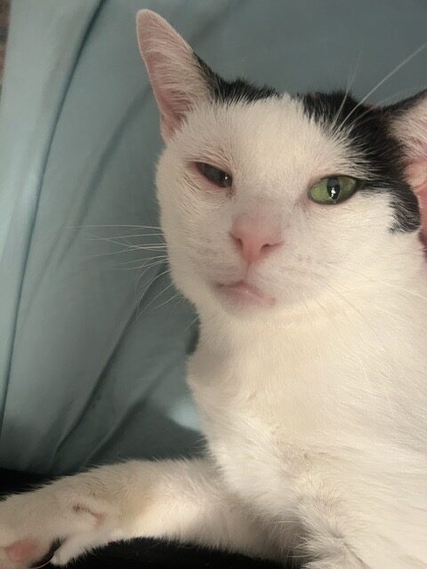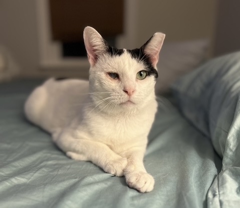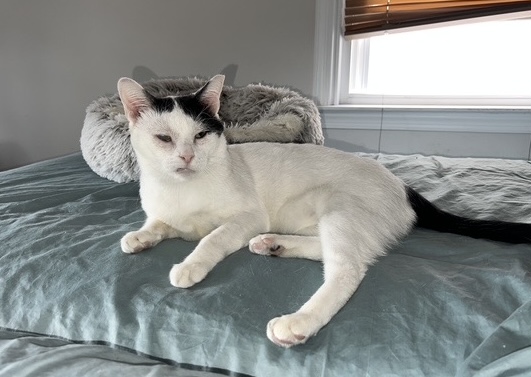 Meet Odin! This handsome boy was living in an alley in Philadelphia. He had a traumatic eye injury, and his eyelid had adhered to his cornea. He has since had surgery to correct it, and while the vision in his right eye will always be cloudy, he gets along just fine! Now he is just the sweetest, most grateful guy. He is enjoying the perks of indoor cat life—he loves to eat, watch birds and chipmunks on Youtube, and, more than anything, snuggle. He will lay on top of you as soon as you lay down, and he will sleep on you all night if you let him.