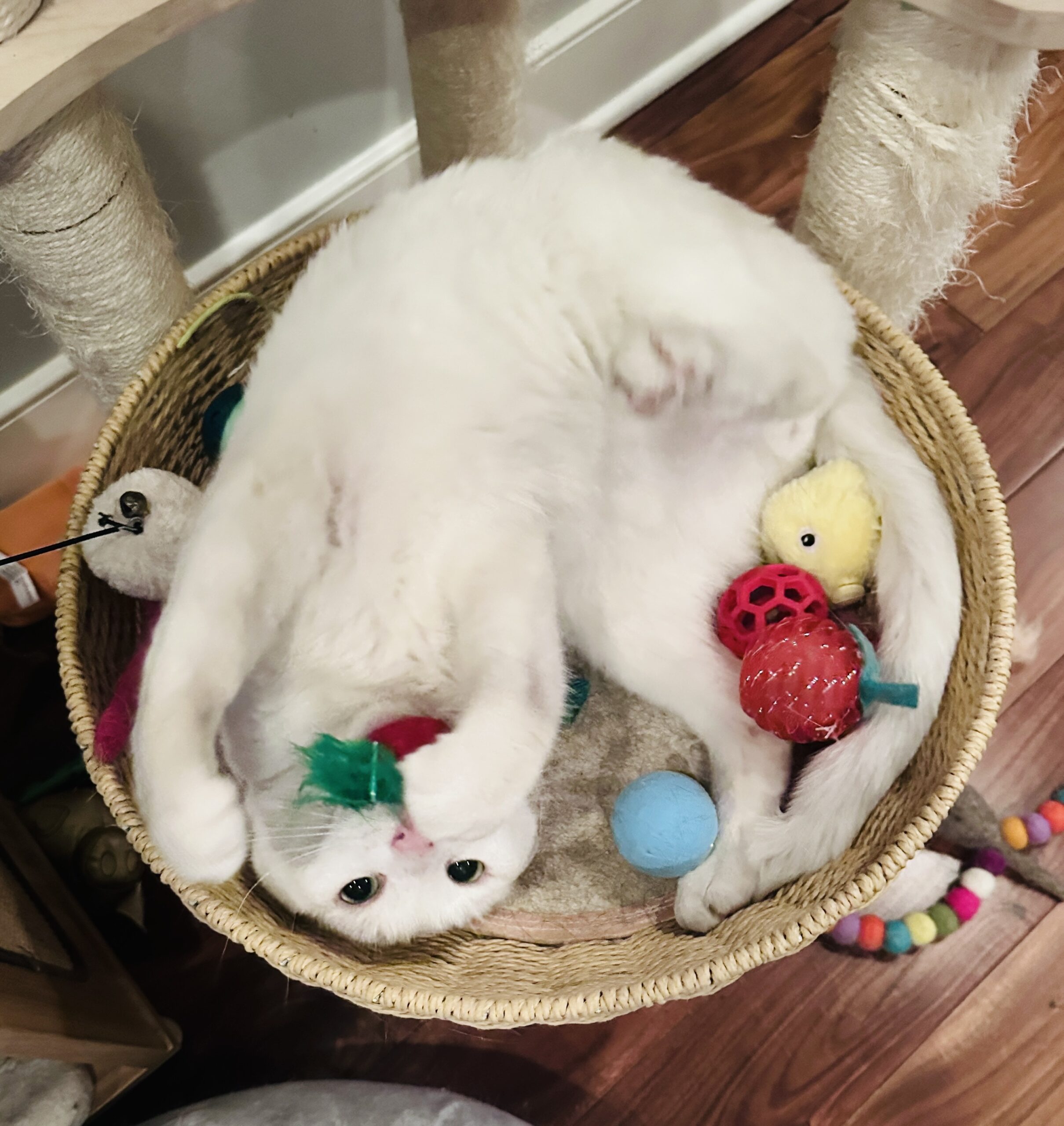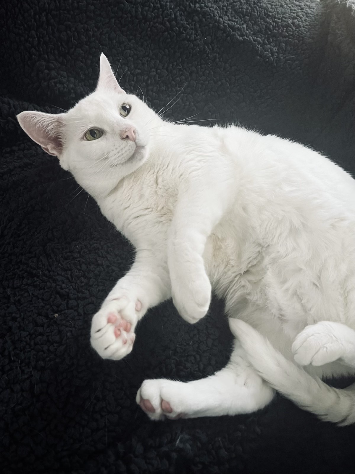 Olaf is a gentle, big-hearted white cat with a story as endearing as his personality. At around 2 or 3 years old, this handsome fellow was found braving the bitter cold, and now he’s looking for a warm, forever home to call his own. His favorite pastime is indulging in long, luxurious naps. Whether he’s dozing in a sunny spot or curling up on his favorite cushion, his relaxed demeanor is truly contagious. When he’s not napping, Olaf loves to sit at the window, intently watching birds flutter by and squirrels scamper about. His curiosity and quiet charm make every day feel like a gentle adventure. Not only is Olaf a delightful observer of the world, he’s also wonderfully sociable with other cats. His easygoing nature means he’s more than happy to share his space and affection with feline friends. He would also be perfectly smitten to be your one and only.
