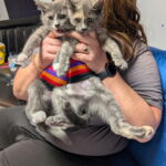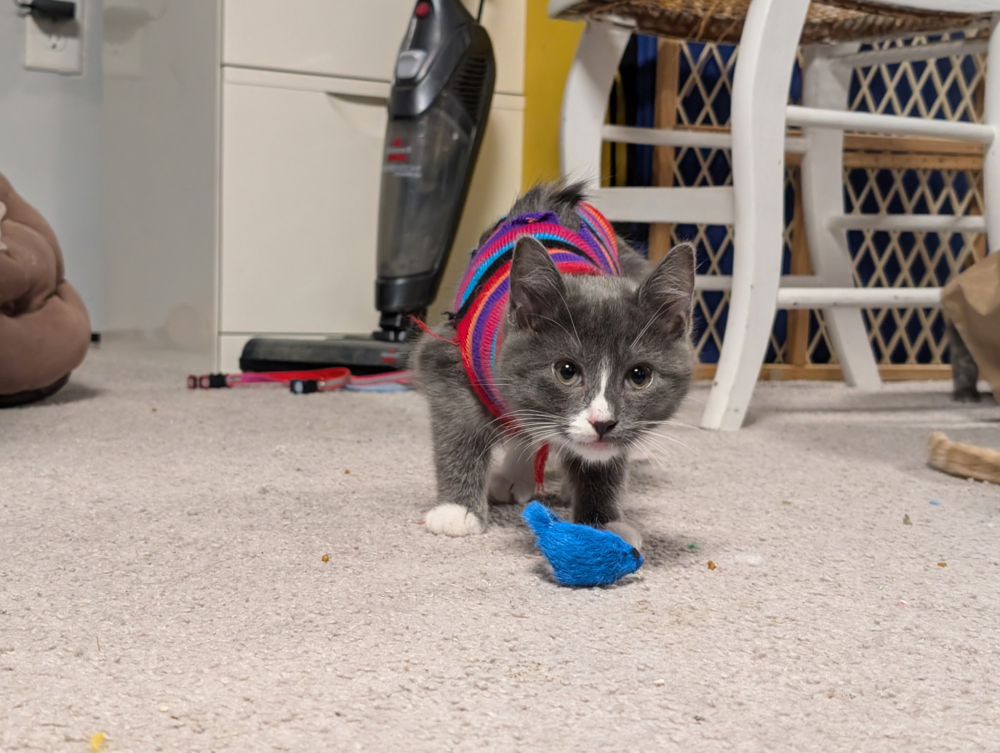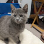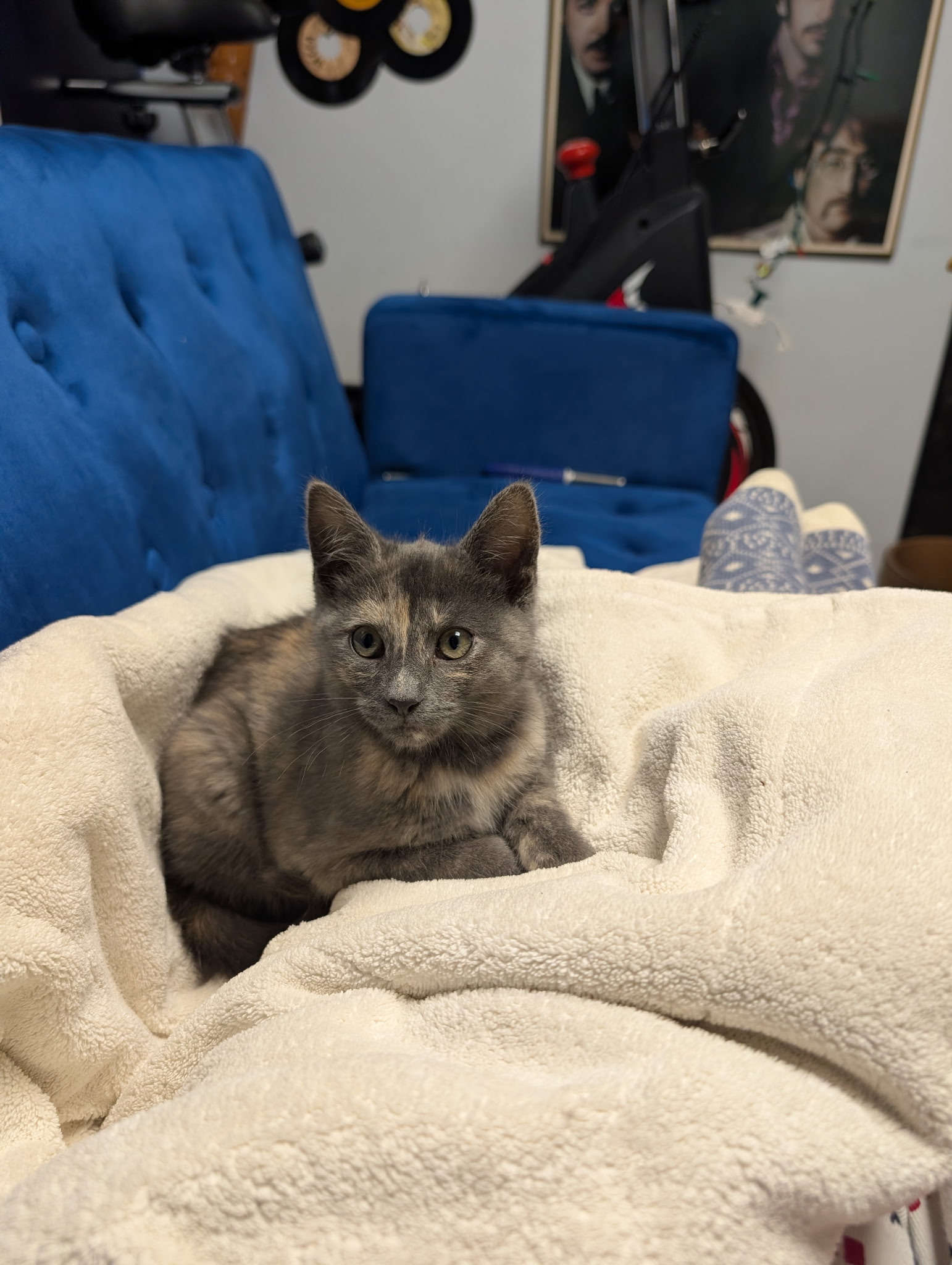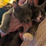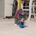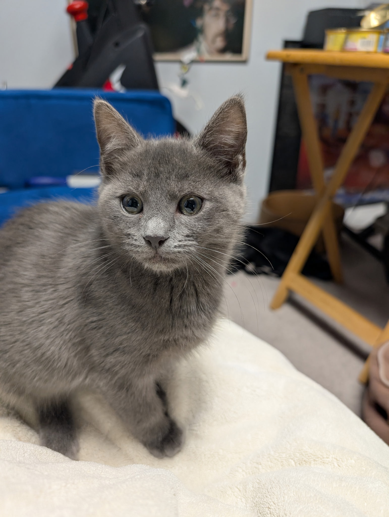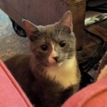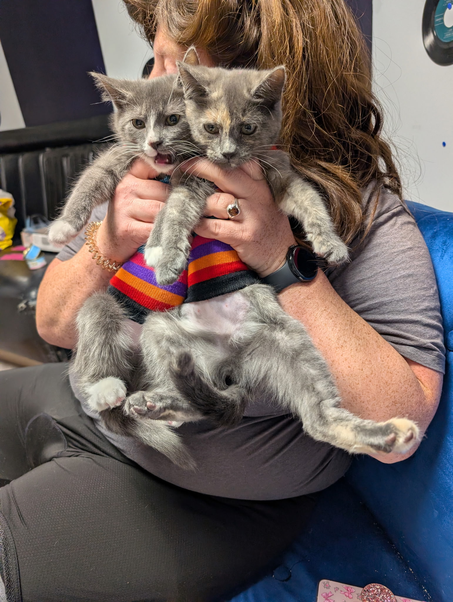 Duster, the grey‑and‑white girl, is the gentle heartbeat of the litter. She blossomed the moment she felt safe, revealing a tender, affectionate soul who loves curling up against someone she trusts. She carries the calm sweetness of her beginnings and is ready for a forever home where she can continue growing with one of her littermates by her side.