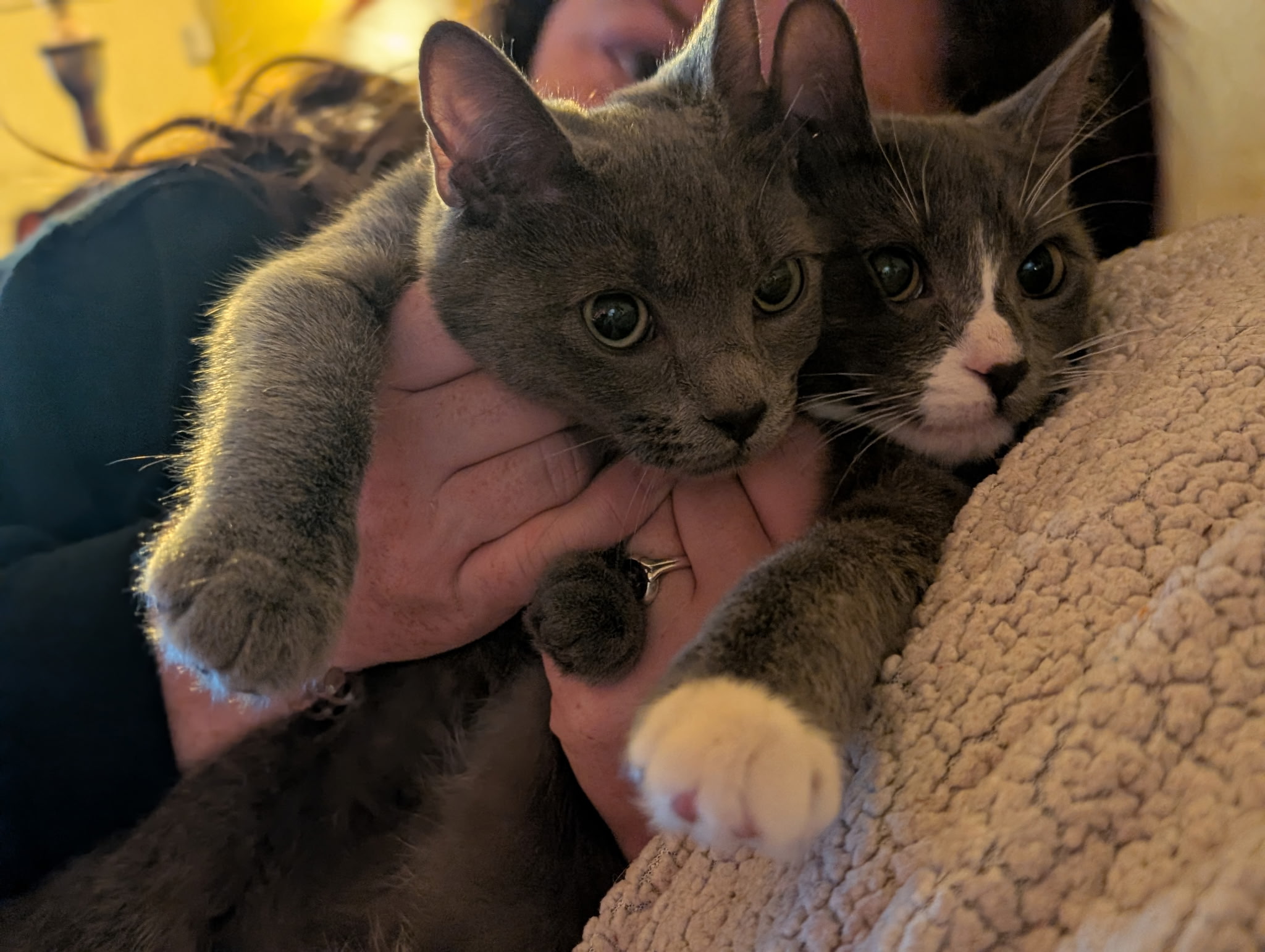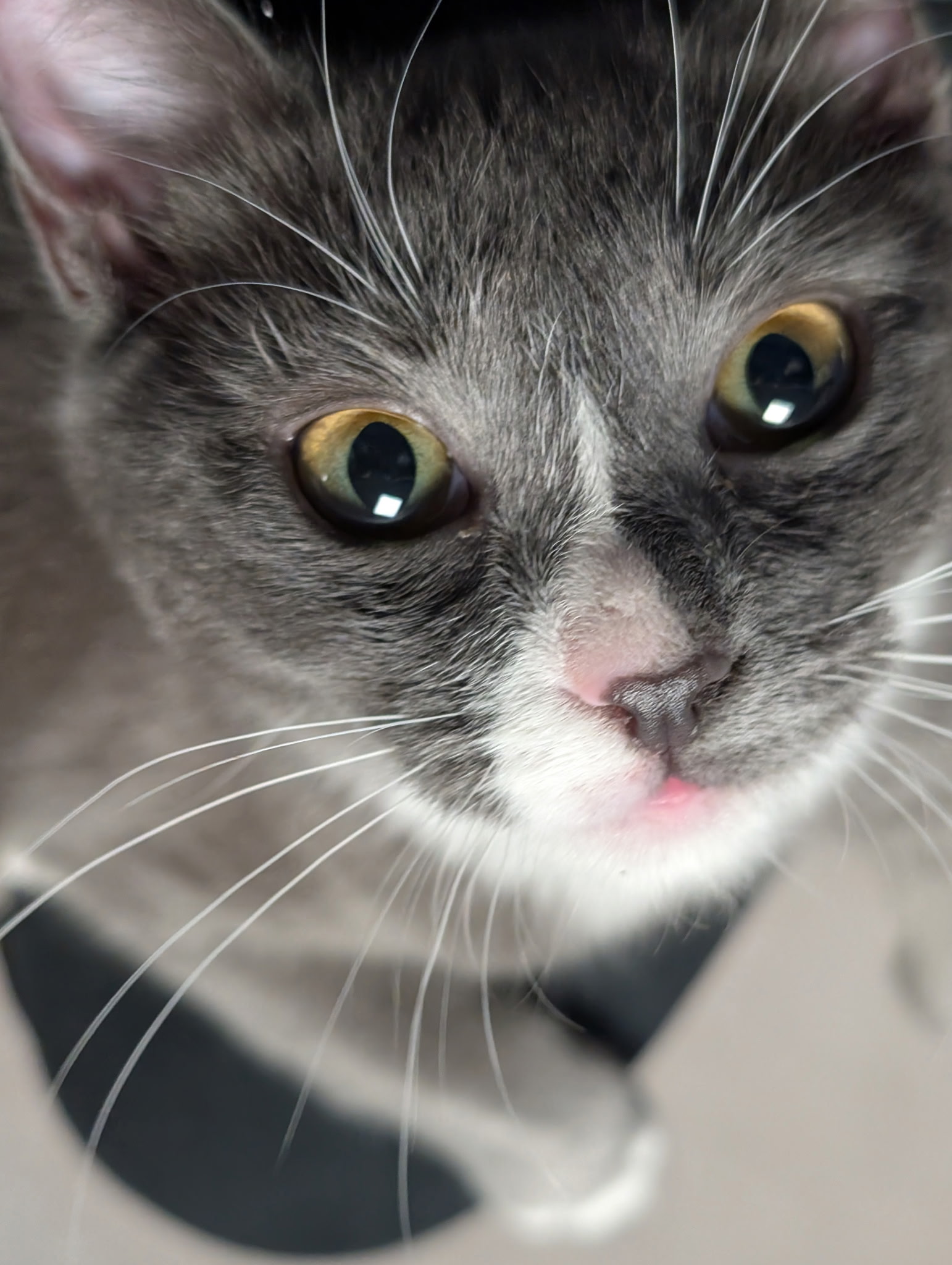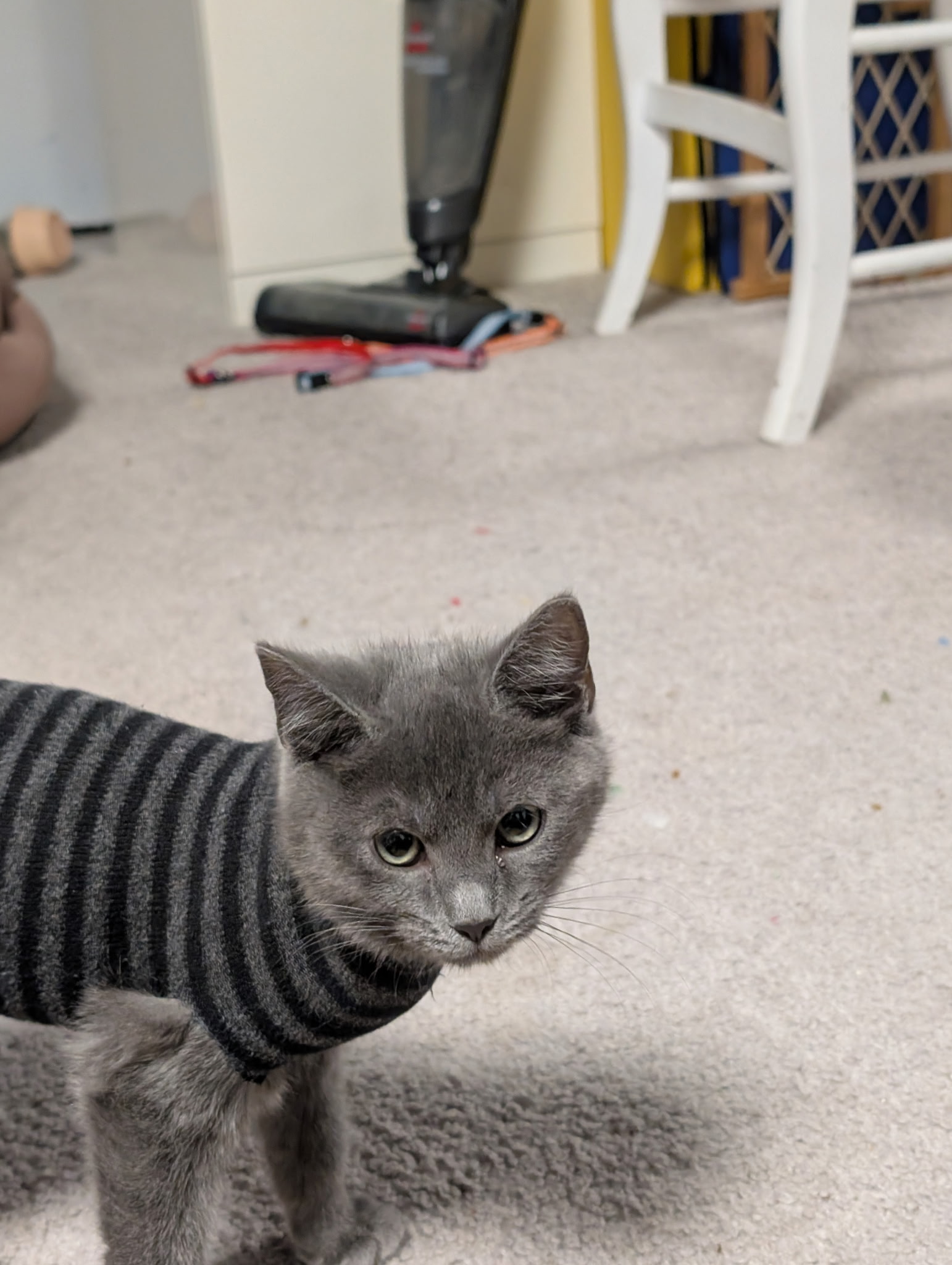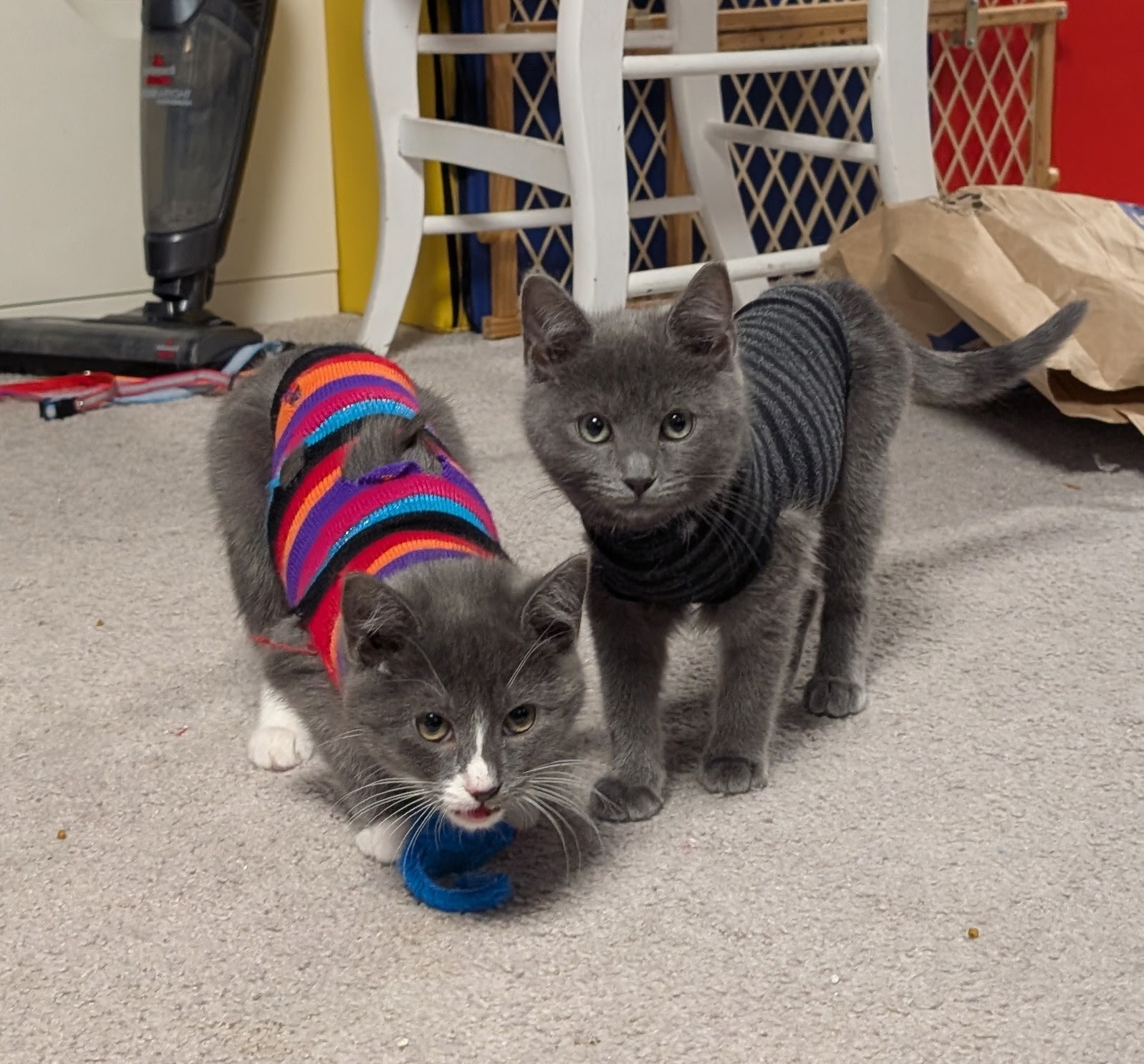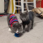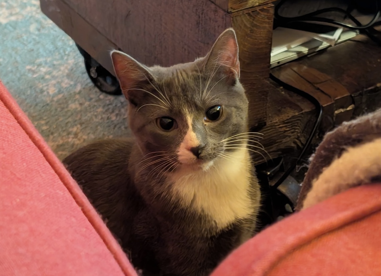 Duster, the grey‑and‑white girl, is the gentle heartbeat of the litter. She blossomed the moment she felt safe, revealing a tender, affectionate soul who loves curling up against someone she trusts. She carries the calm sweetness of her beginnings and is ready for a forever home where she can continue growing with one of her littermates by her side.