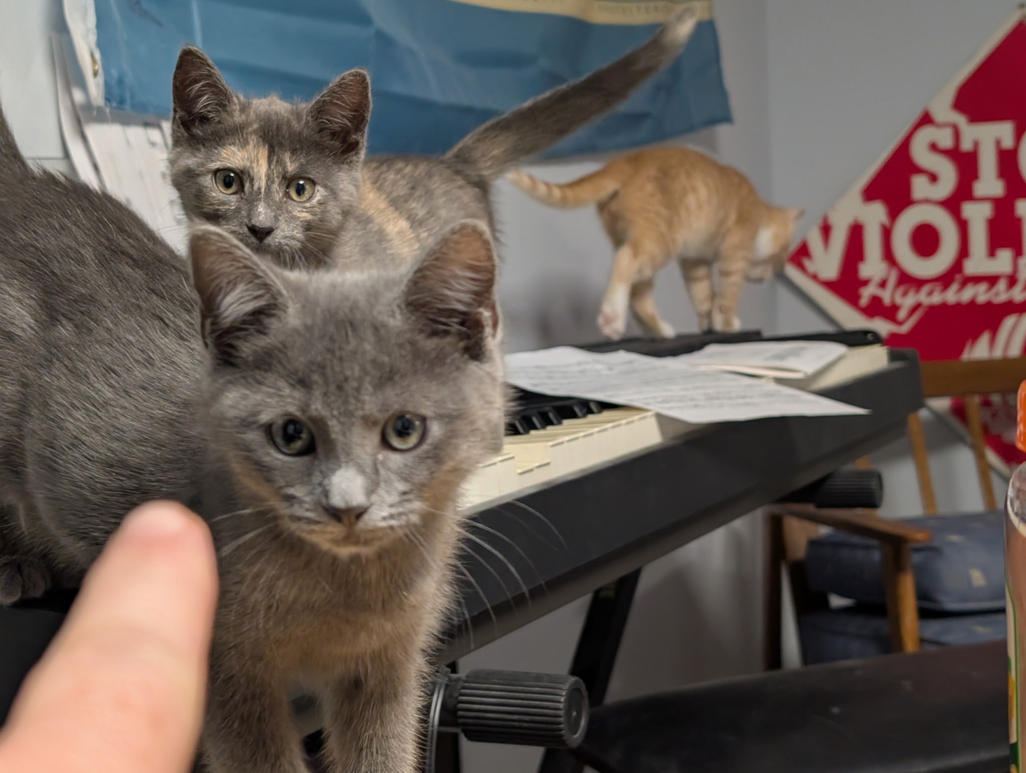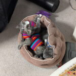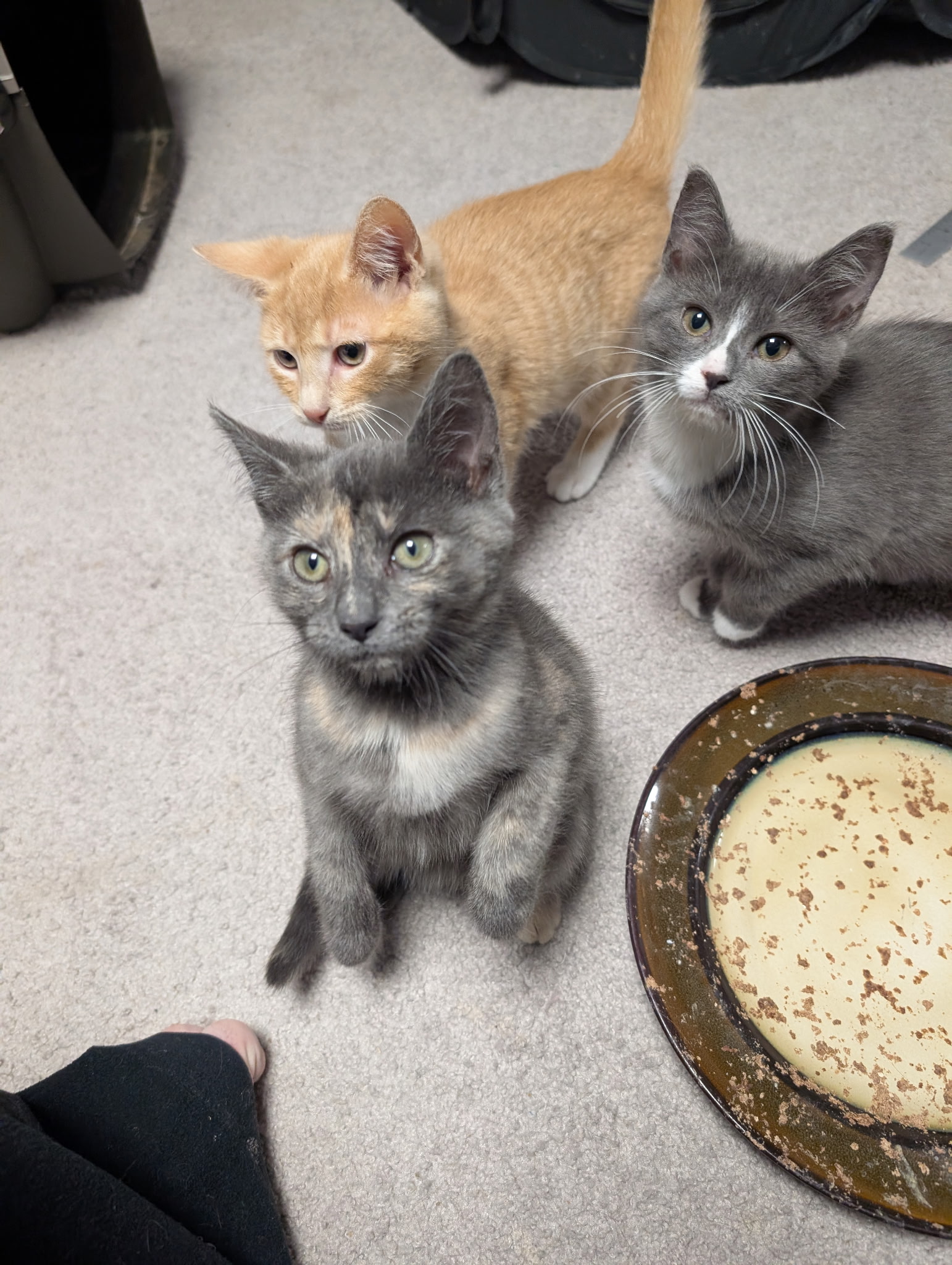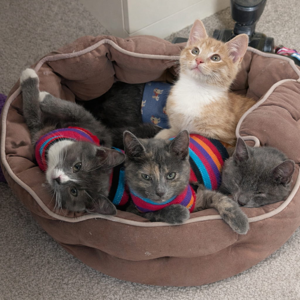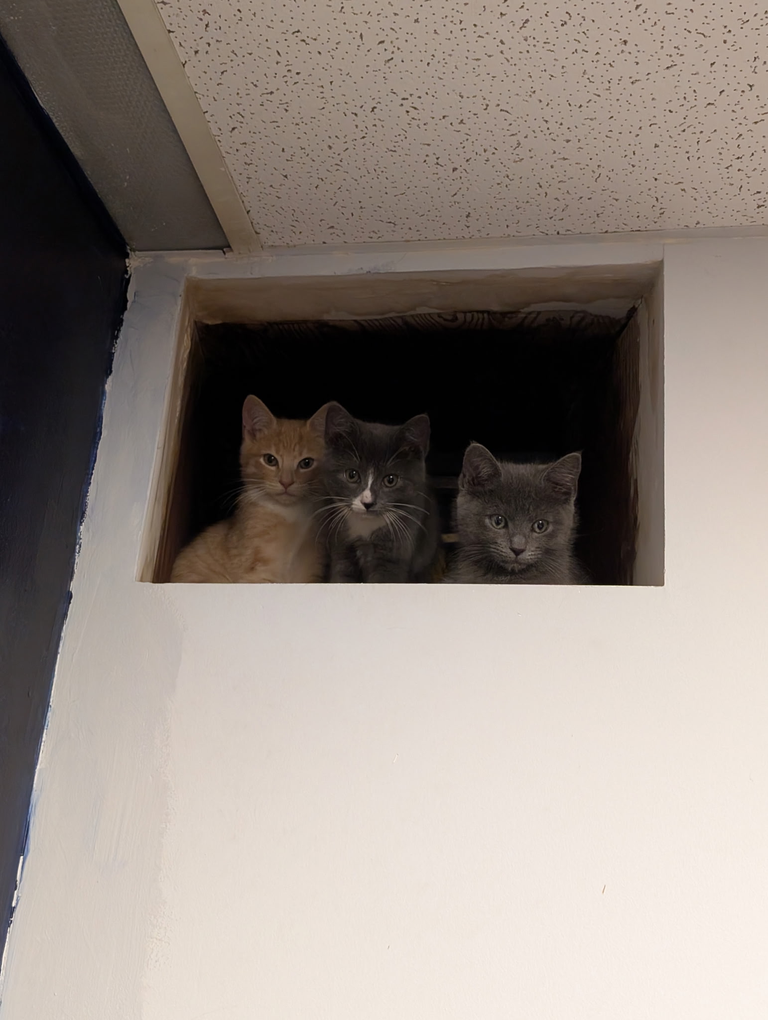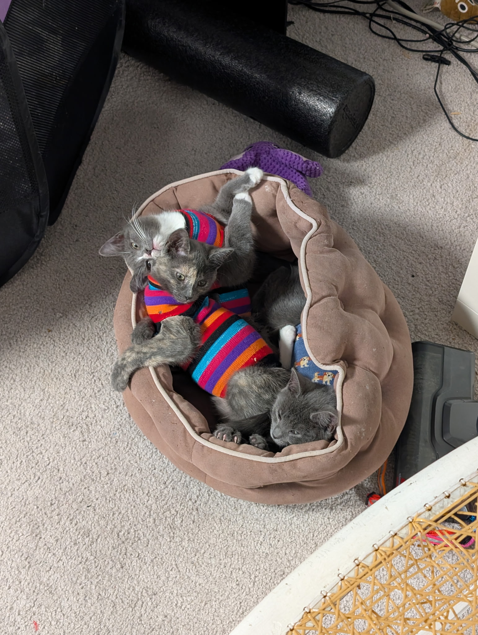 Felicia has since been adopted, her long chapter of worry finally closed. And now her four kittens — Creamsicle, Danielle Steel, Peanut Butter, and Duster — are three months old and ready to begin the part of the story where everything gets brighter. They’ve grown from foundation shadows into soft, playful, deeply bonded little souls who still sleep in a pile, still look for each other first, still carry the quiet strength of their earliest days.