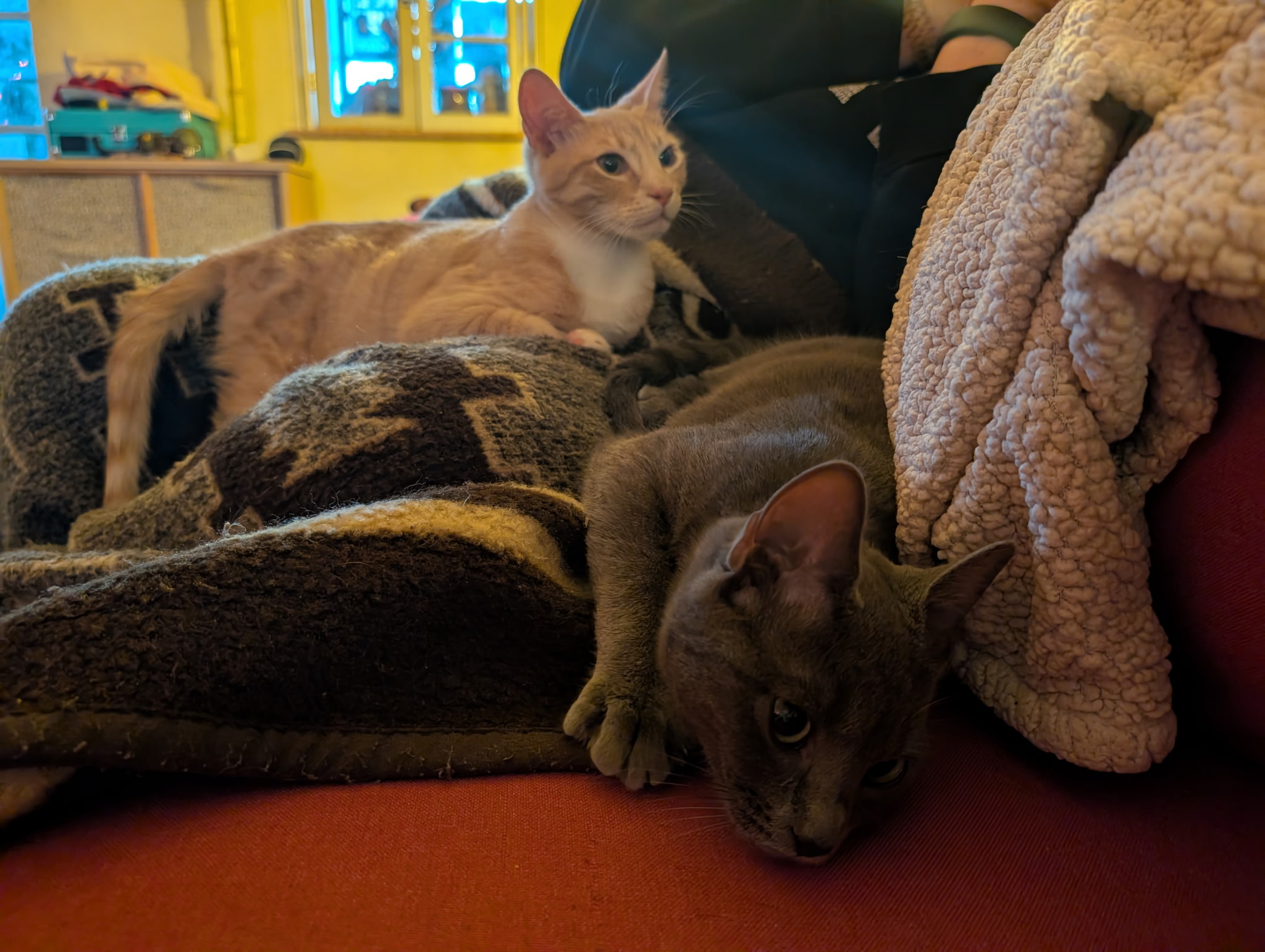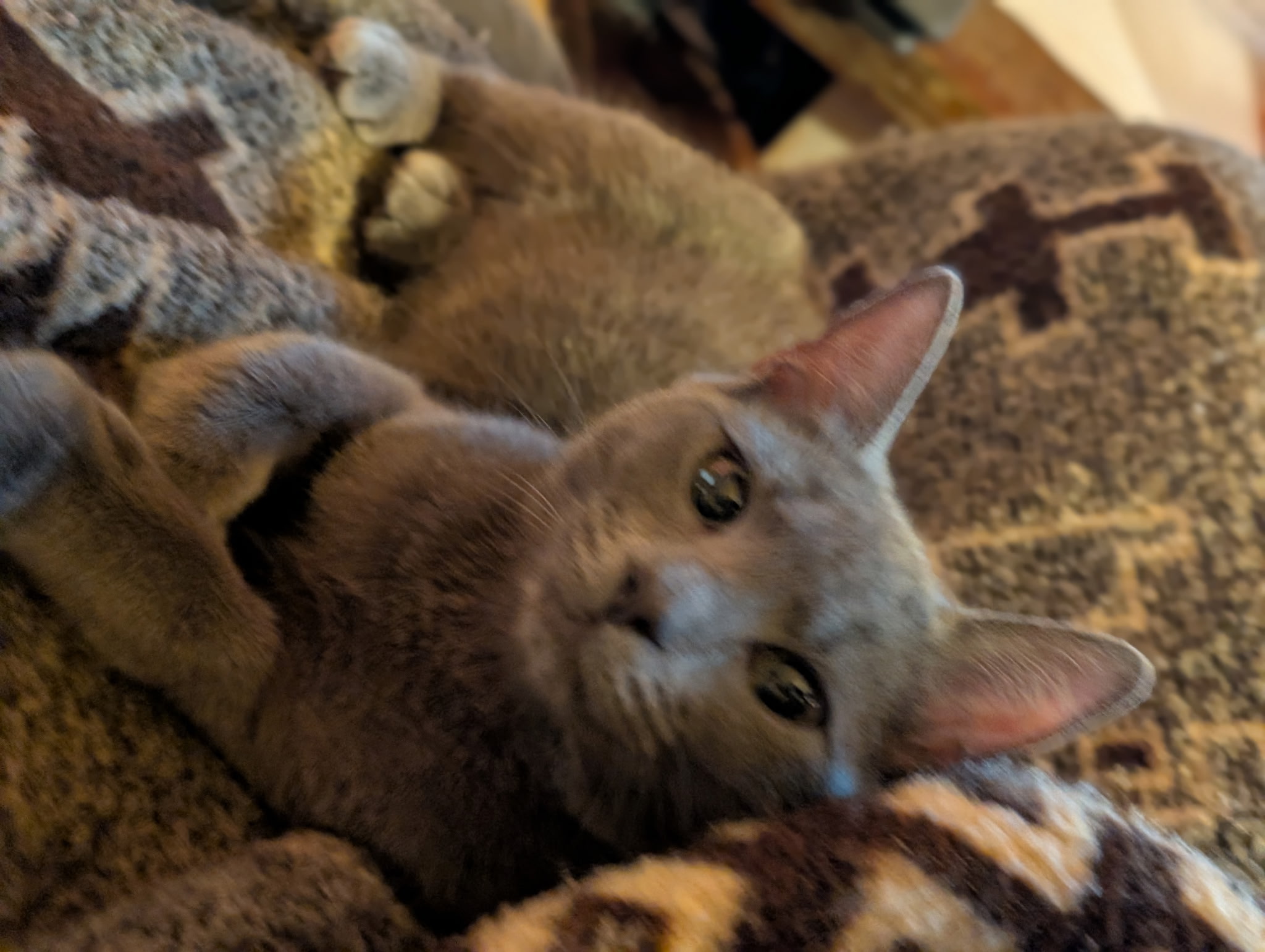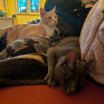 Her kittens — Creamsicle, Danielle Steel, and Duster — have grown from tiny shadows into playful, affectionate, deeply bonded little ones. They still sleep in a pile and look for each other first.
