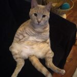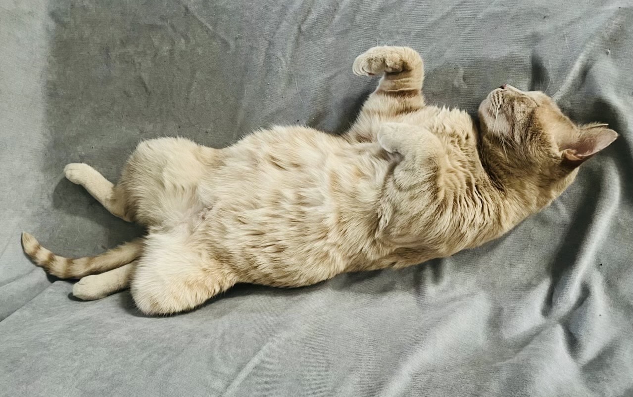 At first, we thought RayRay was middle-aged, but with his kitten-like energy, he may be younger. When rescued, he was thin and missing fur on his back half, but he’s now gaining weight and his coat is growing back beautifully. He eats like he’s never been fed before and will always be first in line at mealtime!
