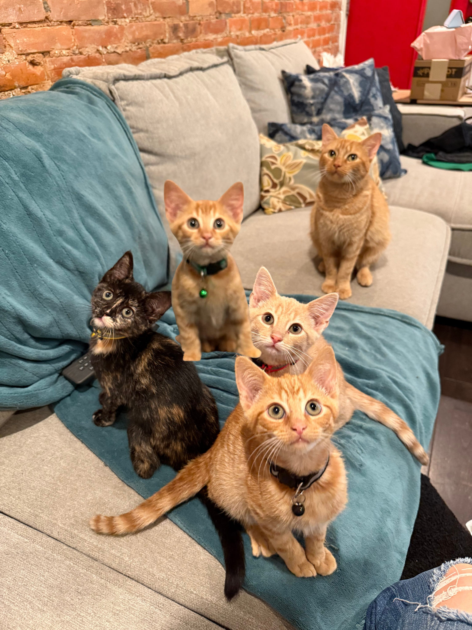 Born to Avaline, a resilient mama who protected them through uncertainty, these four kittens began life in the shadows—hidden, vulnerable, and unknown. One by one, they emerged: three orange boys with hearts full of sunshine, and one tortie girl with a spark all her own. They didn’t grow up in a cozy nursery. They learned to be brave in the face of wind, noise, and hunger. But through it all, they had each other.